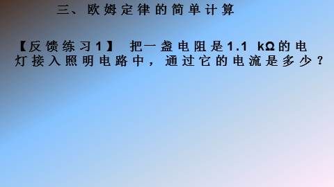 【反馈练习1】 把一盏电阻是1.1 kXXXXX的电灯接入照明电路中,通过它的电流是多少?