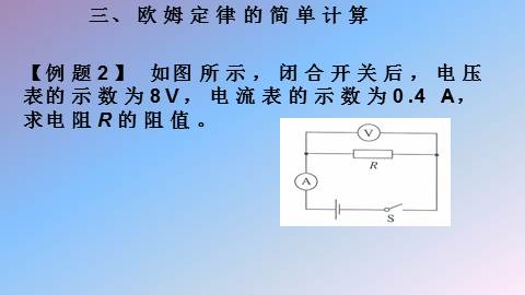 【例题2】 如图所示,闭合开关后,电压表的示数为8V,电流表的示数为0.4 A,求电阻R的阻值。