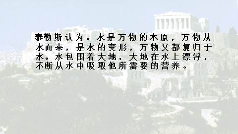 泰勒斯认为:水是万物的本原,万物从水而来,是水的变形,万物又都复归于水。水包围着大地,大地在水上漂浮,不断从水中吸取他所需要的营养。