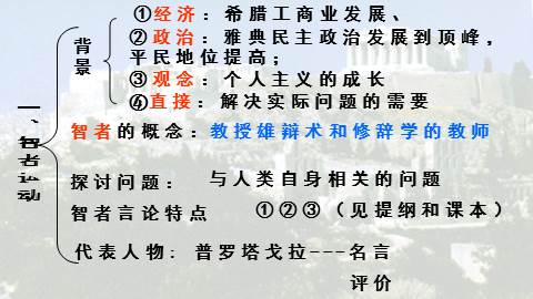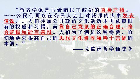 “智者学派是古希腊民主政治的直接产物。XXXXXXXXXX公民们可以在公民大会上对城邦的大事发表演说,。人们参加公共政治文化活动不再依赖旧有的权威和习惯,而靠自己意见的正确合理,符合逻辑和能言善辩。人们为了满足这种需要,迫切地要求提高自己的思想文化修养和善于言辞的本领。”