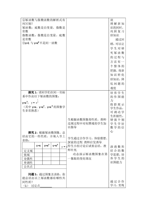 过程与方法:通过作图并观察、总结幂函数的性质,培养学生的作图能力,观察、分析、归纳总结的能力,体会类比在研究问题中的作用,渗透数形结合的思想.