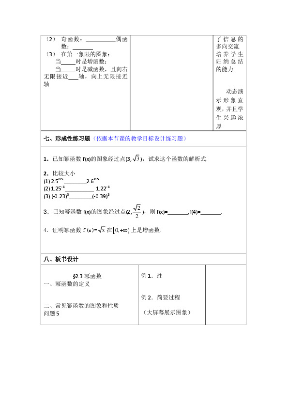 教学手段:自制多媒体课件,帮助学生通过幂函数的图象更直观的理解其性质,几何画板动态演示,激发学生学习热情,投影展示学生作品,让学生树立学好数学的信心.