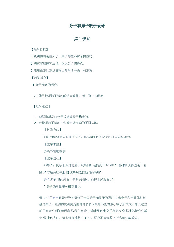 以下为《分子和原子教学设计》的无排版文字预览,完整格式请下载
