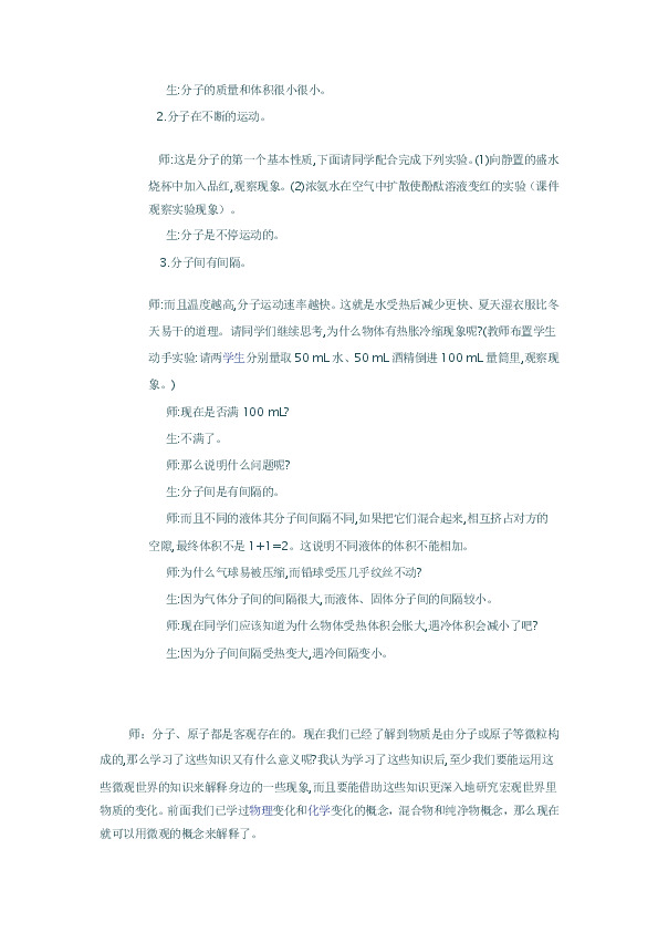 ? 师:这是分子的第一个基本性质,下面请同学配合完成下列实验。(1)向静置的盛水烧杯中加入品红,观察现象。(2)浓氨水在空气中扩散使酚酞溶液变红的实验(课件观察实验现象)。??? 生:分子是不停运动的。???3.分子间有间隔。