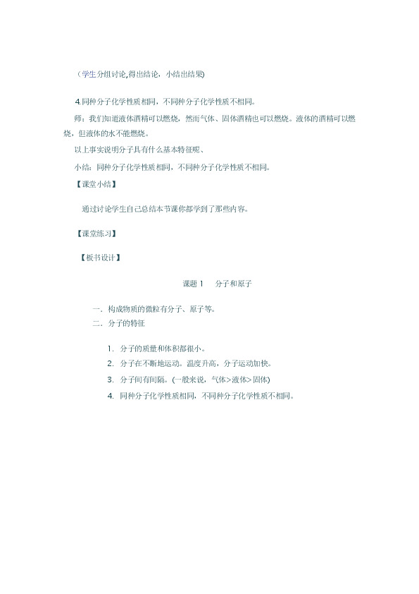 4.同种分子化学性质相同,不同种分子化学性质不相同。??? 师:我们知道液体酒精可以燃烧,然而气体、固体酒精也可以燃烧。液体的酒精可以燃烧,但液体的水不能燃烧。??? 以上事实说明分子具有什么基本特征呢、??? 小结:同种分子化学性质相同,不同种分子化学性质不相同。??? 【课堂小结】