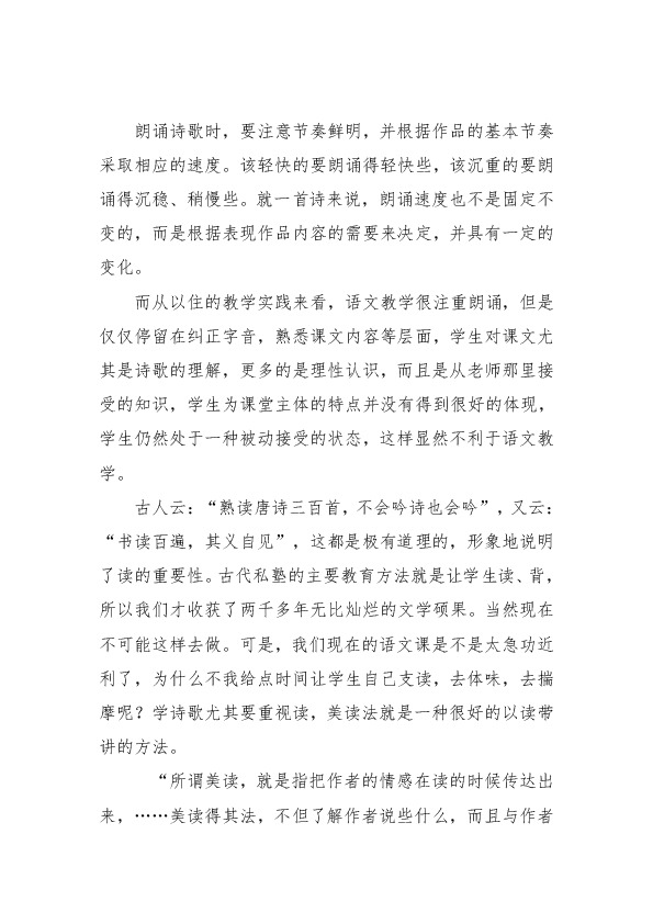 古人云:“熟读唐诗三百首,不会吟诗也会吟”,又云:“书读百遍,其义自见”,这都是极有道理的,形象地说明了读的重要性。古代私塾的主要教育方法就是让学生读、背,所以我们才收获了两千多年无比灿烂的文学硕果。当然现在不可能这样去做。可是,我们现在的语文课是不是太急功近利了,为什么不我给点时间让学生自己支某某,去体味,去揣摩呢?学诗歌尤其要重视读,美读法就是一种很好的以读带讲的方法。