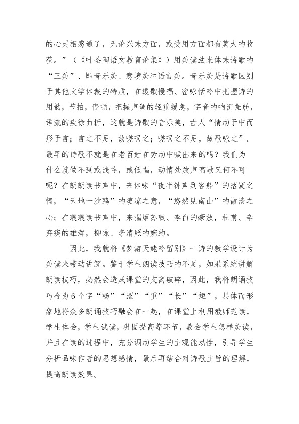 因此,我就将《梦游天姥吟留别》一诗的教学设计为美读来带动讲解。鉴于学生朗读技巧的不足,如果系统讲解朗读技巧,必然会造成课堂的支离破碎,因此,我将朗诵技巧合为6个字“畅”“涩”“重”“长”“短”,具体而形象地将众多朗诵技巧融会在一起,在课堂上利用教师范读,学生体会,学生试读,巩固提高等环节,教会学生怎样美读,并且在读的过程中,充分调动学生的主观能动性,引导学生分析品味作者的思想感情,最后再结合对诗歌主旨的理解,提高朗读效果。
