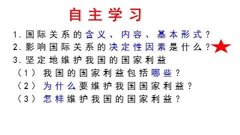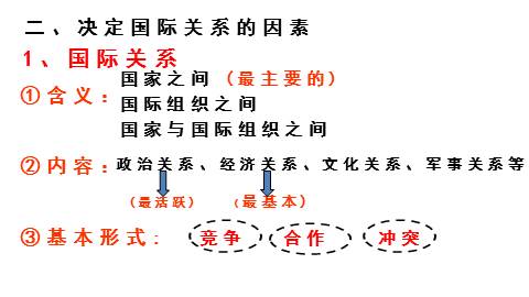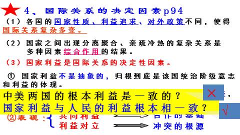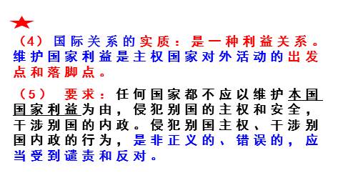 (4)国际关系的实质:是一种利益关系。维护国家利益是主权国家对外活动的出发点和落脚点。