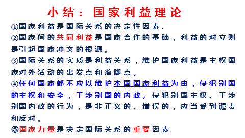 ②理论原因:国家利益是国际关系的决定性因素。国家利益是国家生存与发展的权益,维护国家利益是主权国家对外活动的出发点和落脚点。