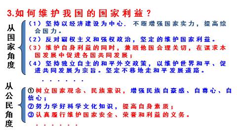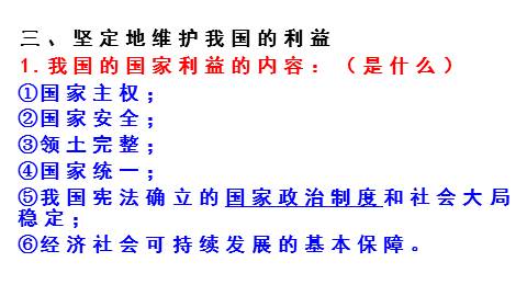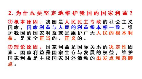 ①根本原因:我国是人民民主专政的社会主义国家,国家利益与人民的利益根本相一致。维护我国的国家利益就是维护广大人民的根本利益,是完全正当的、正义的。