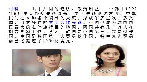 材料一:出于共同的经济、政治利益, 中韩于1992年8月建立外交关系以来,两国关系迅速发展。中韩民间往来和各个领域的交流,形成了多层次、多渠道、形式多样的交流合作关系。中国已成为韩国国民最大的海外旅行目的地国。两国共有几十万人在对方国家工作、学习。韩国是中国第三大贸易伙伴国,中国是韩国第一大贸易伙伴国,韩中双边贸易额已经超过了2000亿美元。