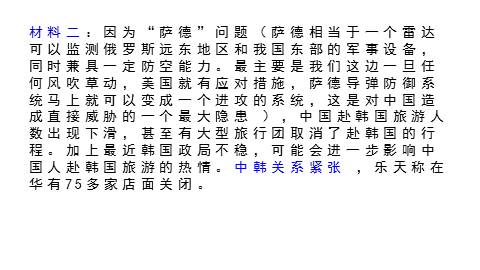 材料二:因为“萨德”问题(萨德相当于一个雷达可以监测俄罗斯远东地区和我国东部的军事设备,同时兼具一定防空能力。最主要是我们这边一旦任何风吹草动,美国就有应对措施,萨德导弹防御系统马上就可以变成一个进攻的系统,这是对中国造成直接威胁的一个最大隐患 ),中国赴韩国旅游人数出现下滑,甚至有大型旅行团取消了赴韩国的行程。加上最近韩国政局不稳,可能会进一步影响中国人赴韩国旅游的热情。中韩关系紧张 ,乐某某在华有75多家店面关闭。