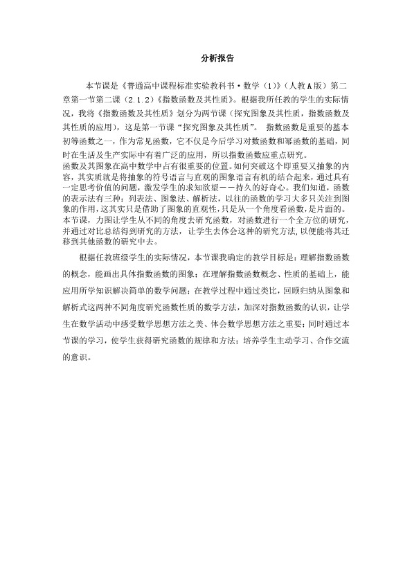根据任教班级学生的实际情况,本节课我确定的教学目标是:理解指数函数的概念,能画出具体指数函数的图象;在理解指数函数概念、性质的基础上,能应用所学知识解决简单的数学问题;在教学过程中通过类比,回顾归纳从图象和解析式这两种不同角度研究函数性质的数学方法,加深对指数函数的认识,让学生在数学活动中感受数学思想方法之美、体会数学思想方法之重要;同时通过本节课的学习,使学生获得研究函数的规律和方法;培养学生主动学习、合作交流的意识。