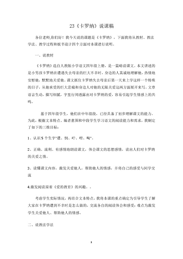 各位老师,你们好!我今天说的课题是《卡罗纳》,下面我将从教材、教法学法、教学过程和板书设计四个方面对本课进行说明。