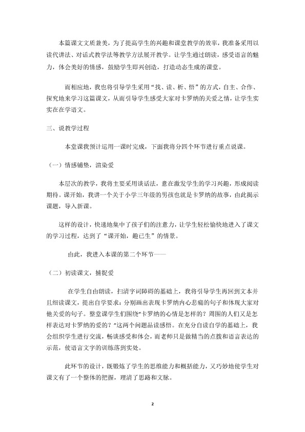 ???教学时,先让学生通读课文,落实具体的语言文字。然后从体会老师的爱、体会“我”的爱、体会同学的爱、体会“我”的母亲的爱四个方面进行分析指导。抓住句子中的关键词,引导学生感受其中的情感,打到朗读训练的目的。最后根据交流小结:这同情、怜悯、关爱等情感都包含着周围人对卡罗纳深深的爱。