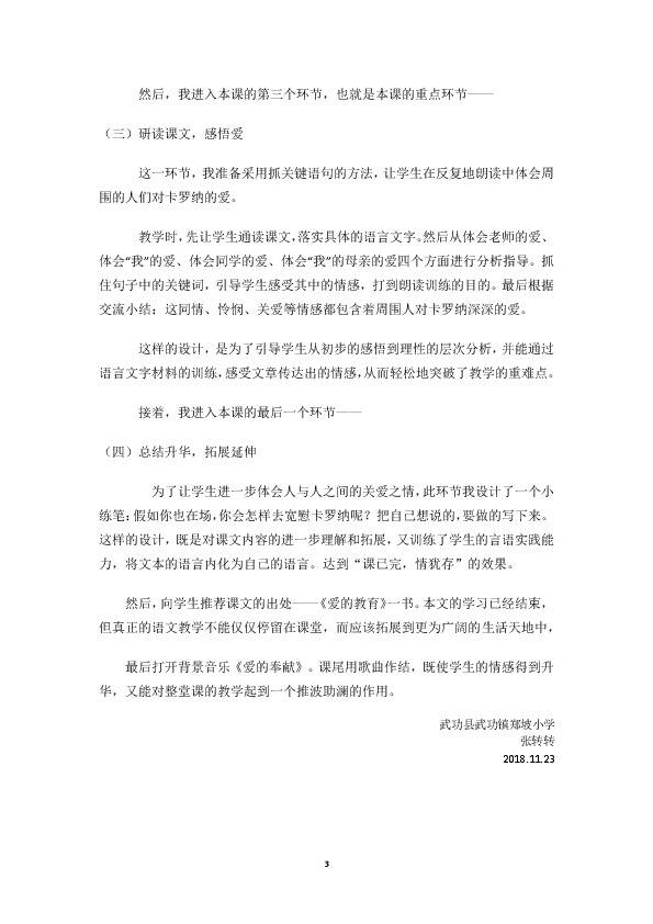 ??? 在学生自由朗读,扫清字词障碍的基础上,我将引导学生再回到文本并且细读课文,提出自学要求:分别画出表现卡罗纳内心悲痛的句子和体现大家对他关爱的句子。整堂课学生们围绕“卡罗纳的心情是怎样的?周围的人们又是怎样表达对卡罗纳的爱的?”这两个问题品读感悟。在充分自读自学的基础上,我会组织学生进行交流,畅谈感受和体会,而老师只是做精当的点拨和语言表达的示范,使语言文字的训练落到实处。