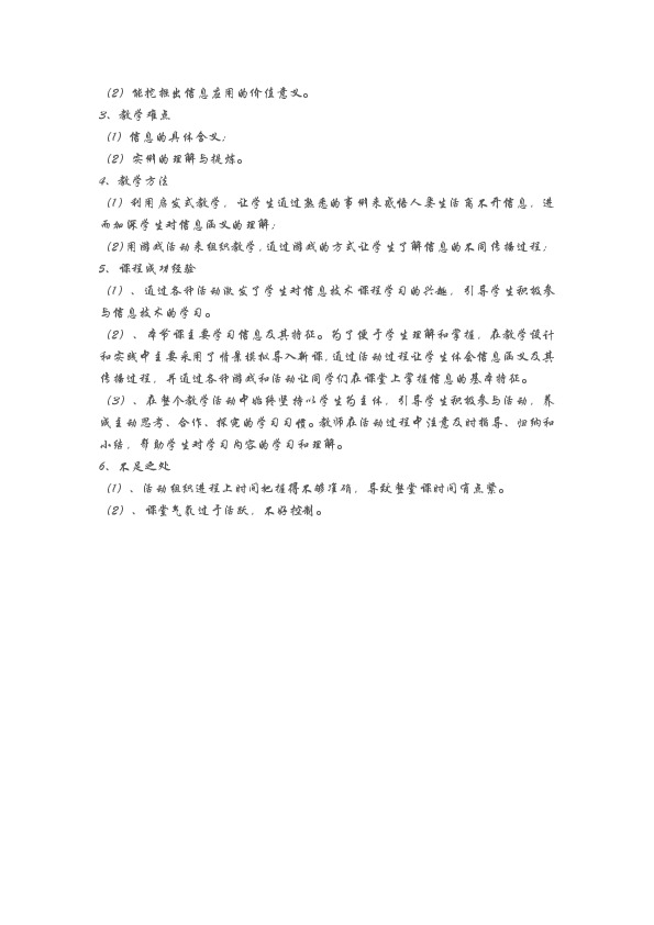 (2)、本节课主要学习信息及其特征。为了便于学生理解和掌握,在教学设计和实践中主要采用了情景模拟导入新课,通过活动过程让学生体会信息涵义及其传播过程,并通过各种游戏和活动让同学们在课堂上掌握信息的基本特征。