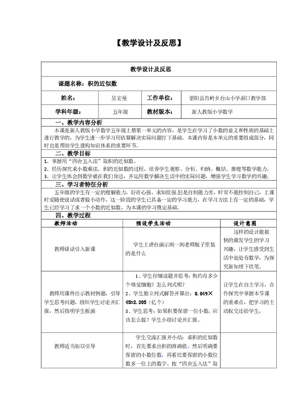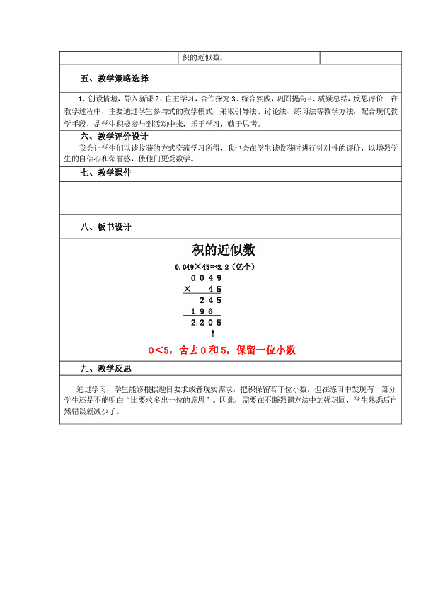 1、掌握用“四舍五入法”取积的近似数。2、经历探究求小数乘法、积的近似数的过程,培养学生观察、分析、归纳、概括、推理等数学能力。