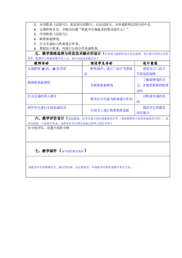 六、教学评价设计(创建量规,向学生展示他们将被如何评价(来自教师和小组其他成员的评价)。也可以创建一个自我评价表,这样学生可以用它对自己的学习进行评价)