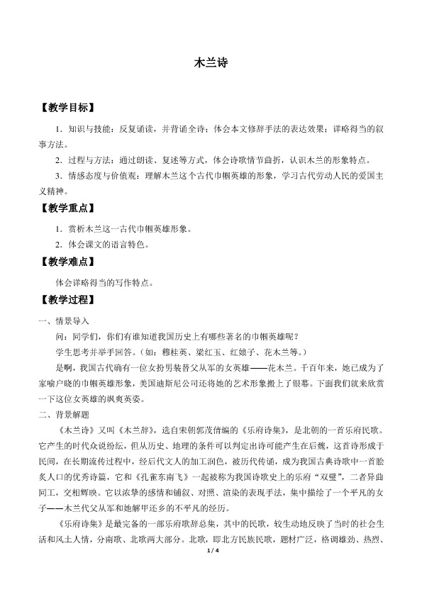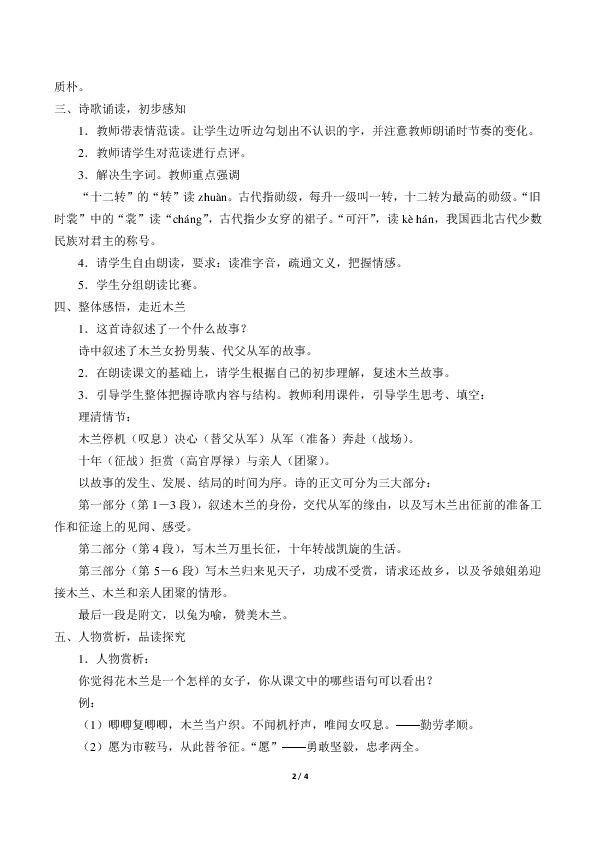3.情感态度与价值观:理解木兰这个古代巾帼英雄的形象,学习古代劳动人民的爱国主义精神。
