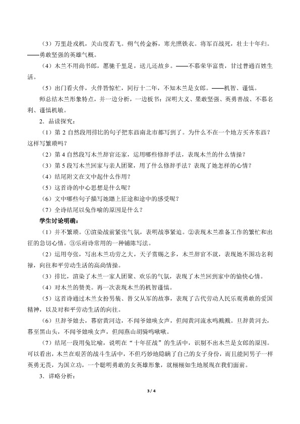 (5)这首诗通过木兰女扮男装、替父从军的故事,表现了古代劳动人民乐观勇敢的爱国精神,以及对和平劳动生活的向往。