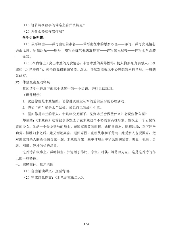 (2)(在内容上)突出木兰的儿女情态,丰富木兰的英雄性格,使人物形象真实感人。(在结构上)详略得当,使全某某显得简洁紧凑。总之,诗歌对能表现中心思想的材料详写,一般的就略写。