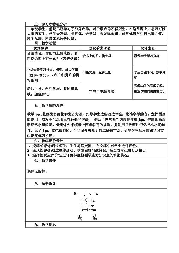 教学jqx,依据发音部位和发音方法,指导学生边实践边体会,发准字母的音。发挥图画的作用,启发学生运用已有经验和方法, 借助“鸡气西”的读音读准jqx。借助图画帮助记忆字母的形。运用课件来演示上两点省写的规则,并利用儿歌帮助记忆“小小真淘气,见了jqx,就把眼睛闭。”学习介母是i的三拼音节是,引导学生运用前课学习方法反复练习拼读。