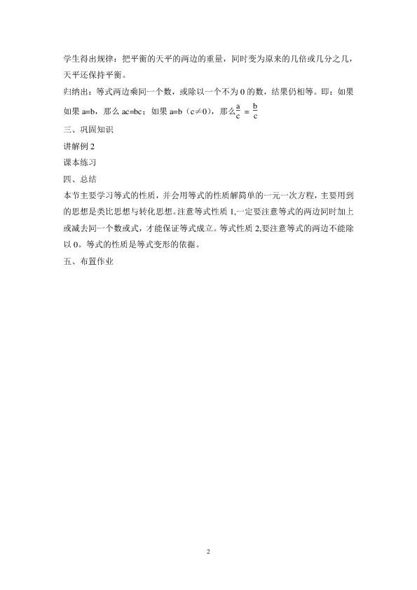 本节主要学习等式的性质,并会用等式的性质解简单的一元一次方程,主要用到的思想是类比思想与转化思想。注意等式性质1,一定要注意等式的两边同时加上或减去同一个数或式,才能保证等式成立。等式性质2,要注意等式的两边不能除以0。等式的性质是等式变形的依据。