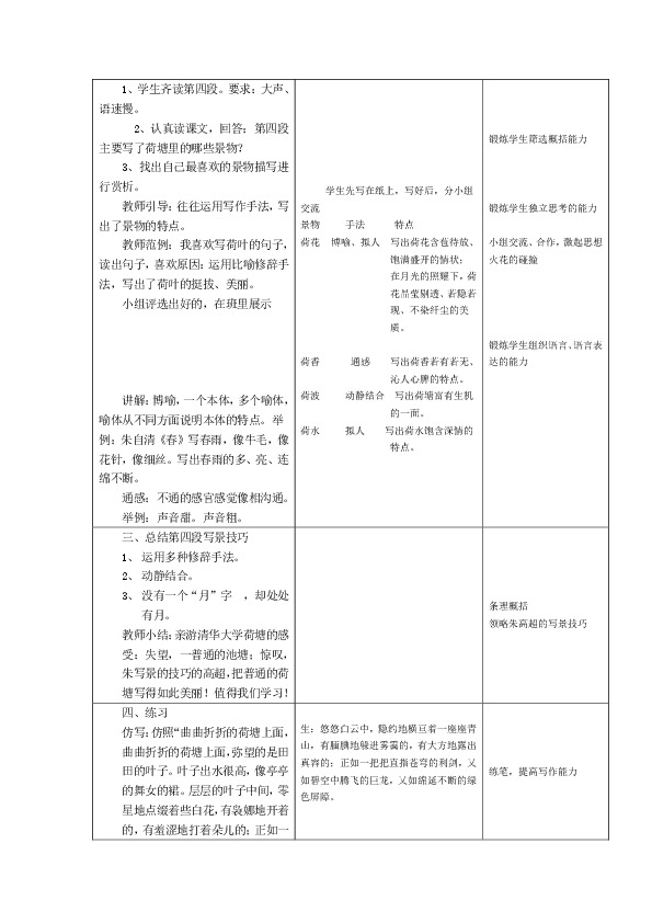 1、教学重点:赏析第四段,掌握比喻、拟人、通感的修辞手法,动静结合手法在第四段的作用。