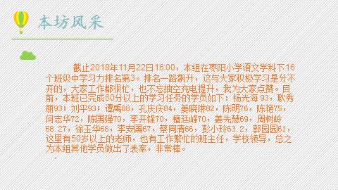 截止2018年11月22日16:00,本组在枣阳小学语文学科下16个班级中学习力排名第3。排名一路飙升,这与大家积极学习是分不开的,大家工作都很忙,也不忘抽空充电提升,我为大家点赞。目前,本班已完成60分以上的学习任务的学员如下:杨某某 93,耿秀丽93;刘平93;谭某某88,孔某某84,姜某某82,陈明76,陈某某75,何某某72,陈某某70,李某某70,檀廷峰70,姜某某69,周某某68.27,徐某某68,李某某67,蔡某某66,彭某某63.2,郭某某61,这里有50岁以上的老师,也有工作繁忙的班主任,学校领导,总之为本组其他学员做出了表率,非常棒。