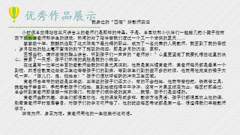 黄老师去年带的班级是三年级,三年级的孩子们还太小,有的不会扫地,他就带着扫把、铁锹等工具,挽起袖子亲自干,手把手教孩子们扫地,直到地被扫得干干净净,没有一片果皮纸屑为止,每回打那经过,总会听到黄老师那像?一样的嗓门,和孩子们铜铃般的笑声XXXXXXXXXX我想:孩子们是幸福的。
