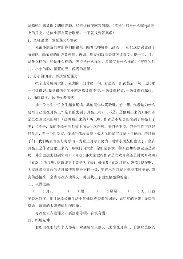抽一位男生一位女生起来诵读,其他同学认真聆听。想一想,作者是为什么要写自己坐在月亮上?是真的去到了月亮上吗?(不是,是他画出来的)那作者是怎么画出来的呢?(想着画出来的)所以啊,作者是不是真的坐到了月亮上了呢?(不是,我们不能坐到月亮上面去)现在啊,咱们是不能,但是我们可以好好学习,当一个科学家,像杨利伟叔叔坐上载人飞船就可以踏上月球啦,所以孩子们,我们现在需要好好学习,为登上月球去努力。刚才小朋友们也说了,坐在月亮上是作者想象出来的,那我问问大家,你们是喜欢一件东西想得到它还是讨厌一件东西想去得到它呀?(喜欢)那大家觉得作者是喜欢月亮还是讨厌月亮呢?(喜欢!)所以啊,这篇课文主要是为了表达出作者(喜欢月亮),没错!现在啊,大家就带着喜欢的这种感情再把全文读一读,要读出在月亮上坐着那种美好、漂亮的感情来。全班再次齐某某课文,并且找出下面空格里的答案。