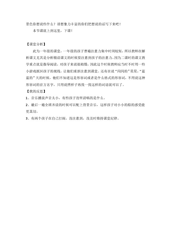 2、最后一遍全班齐某某的时候可以配上背景音乐,这样孩子对小小的船的感受能更真切。
