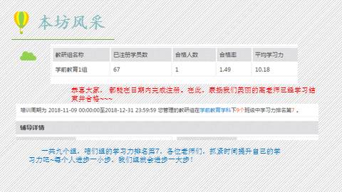 当万籁俱寂,人们都沉沉入睡时,我们还在继续教育网辛勤采撷着;当朋友徜徉咸丰街头,漫步望城楼栈道时,我们还在敲击着键盘。这些天,我们每个人都在忙碌的生活着、工作者、学习着,充实又快乐。希望一组的每位老师都能快乐学习、高效工作,把培训出色地进行到底!