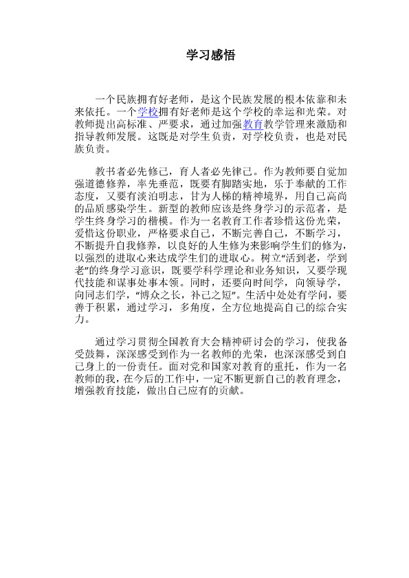通过学习贯彻全国教育大会精神研讨会的学习,使我备受鼓舞,深深感受到作为一名教师的光荣,也深深感受到自己身上的一份责任。面对党和国家对教育的重托,作为一名教师的我,在今后的工作中,一定不断更新自己的教育理念,增强教育技能,做出自己应有的贡献。