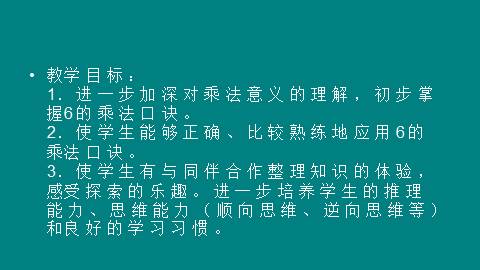 教学目标:1.进一步加深对乘法意义的理解,初步掌握6的乘法口诀。2.使学生能够正确、比较熟练地应用6的乘法口诀。3.使学生有与同伴合作整理知识的体验,感受探索的乐趣。进一步培养学生的推理能力、思维能力(顺向思维、逆向思维等)和良好的学习习惯。