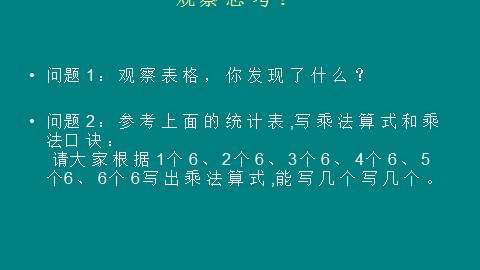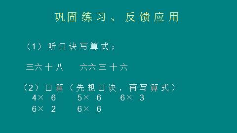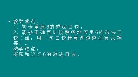 教学重点:1.初步掌握6的乘法口诀。2.能够正确而比较熟练地应用6的乘法口诀(如:用一句口诀计算两道乘法算式题等)。教学难点:探究和记忆6的乘法口诀。