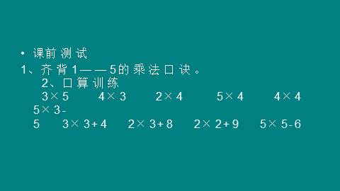 1、齐某某1——5的乘法口诀。 2、口算训练? 3XXXXX5????? 4XXXXX3????? 2XXXXX4?????? 5XXXXX4????? 4XXXXX45XXXXX3-5???? 3XXXXX3+4??? 2XXXXX3+8??? 2XXXXX2+9??? 5XXXXX5-6