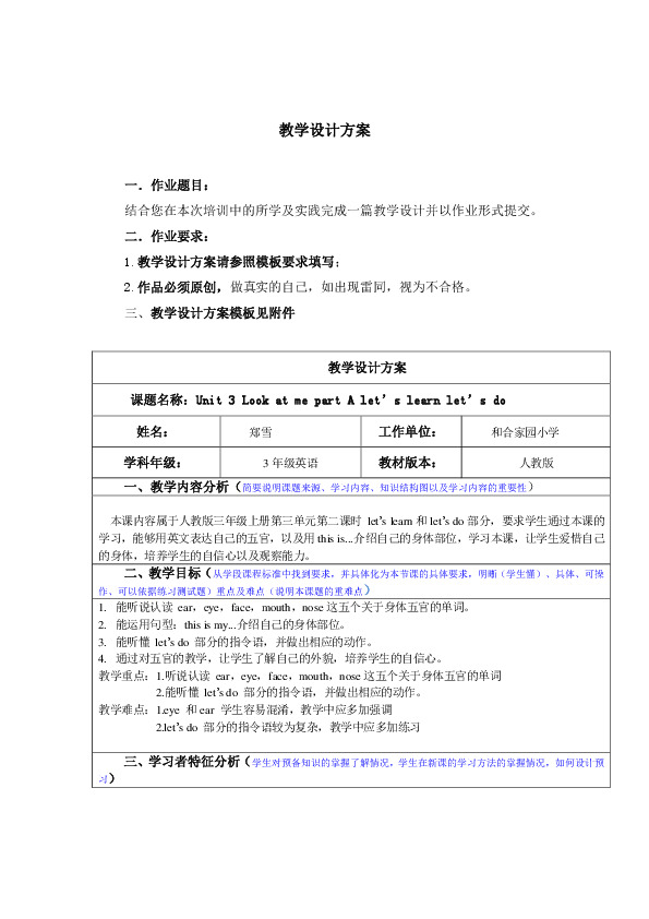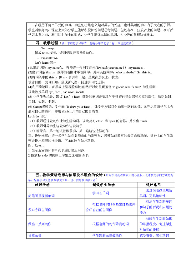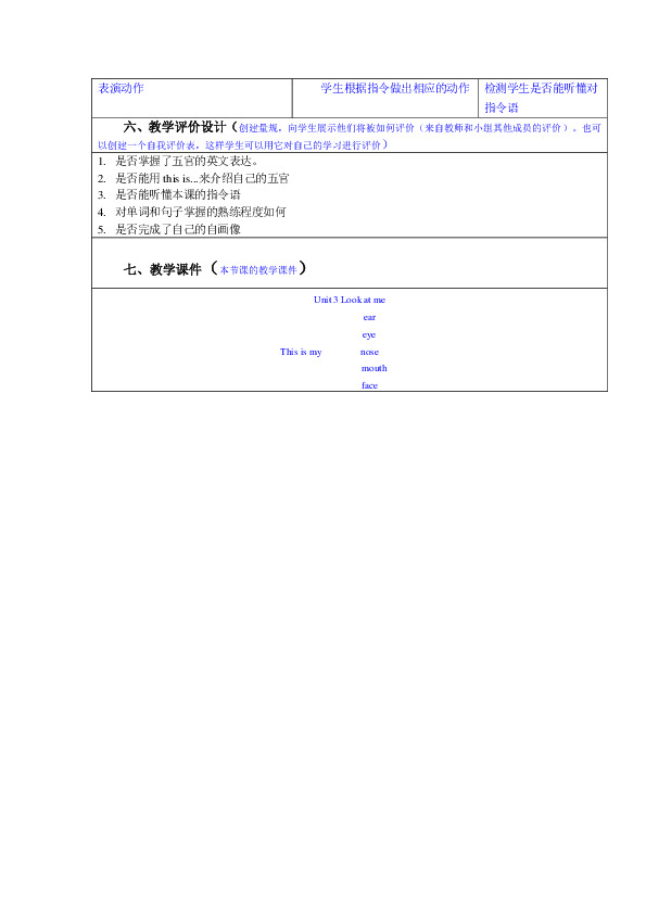 本课内容属于人教版三年级上册第三单元第二课时 let’s learn和let’s do部分,要求学生通过本课的学习,能够用英文表达自己的五官,以及用this is...介绍自己的身体部位,学习本课,让学生爱惜自己的身体,培养学生的自信心以及观察能力。