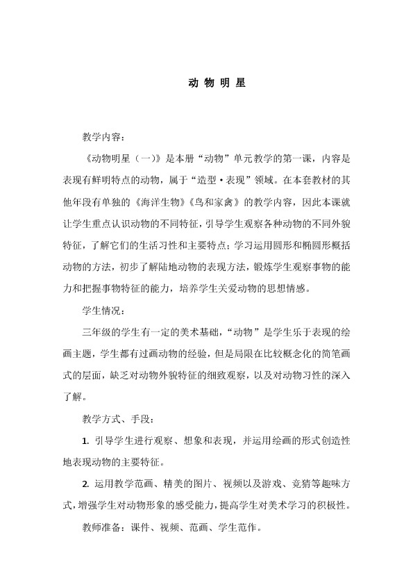 《动物明星(一)》是本册“动物”单元教学的第一课,内容是表现有鲜明特点的动物,属于“造型XXXXX表现”领域。在本套教材的其他年段有单独的《海洋生物》《鸟和家禽》的教学内容,因此本课就让学生重点认识动物的不同特征,引导学生观察各种动物的不同外貌特征,了解它们的生活习性和主要特点;学习运用圆形和椭圆形概括动物的方法,初步了解陆地动物的表现方法,锻炼学生观察事物的能力和把握事物特征的能力,培养学生关爱动物的思想情感。