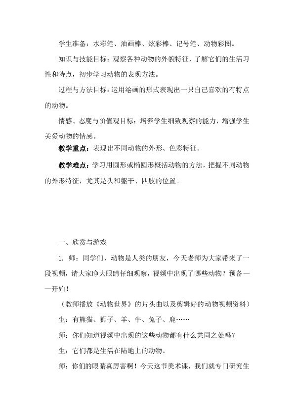 知识与技能目标:观察各种动物的外貌特征,了解它们的生活习性和特点,初步学习动物的表现方法。