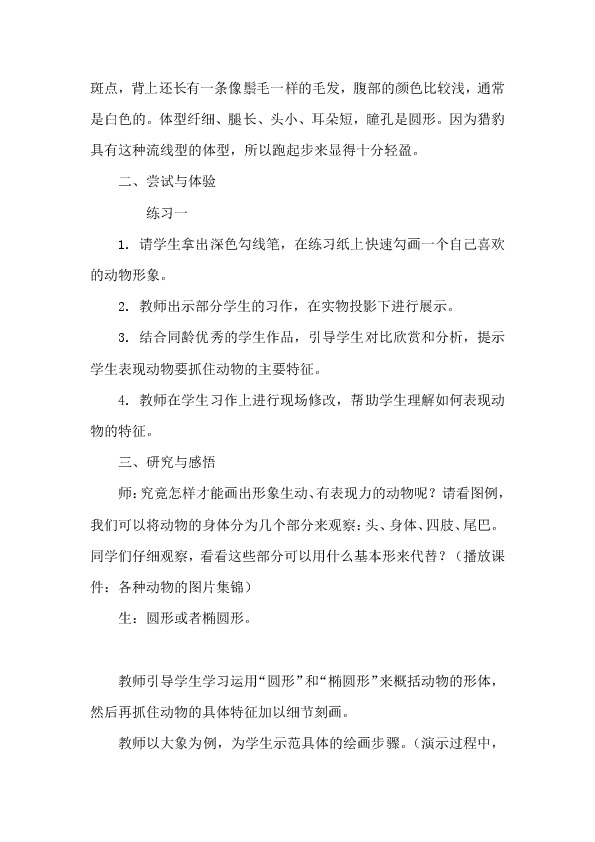 教学难点:学习用圆形或椭圆形概括动物的方法,把握不同动物的外形特征,尤其是头和躯干、四肢的位置。