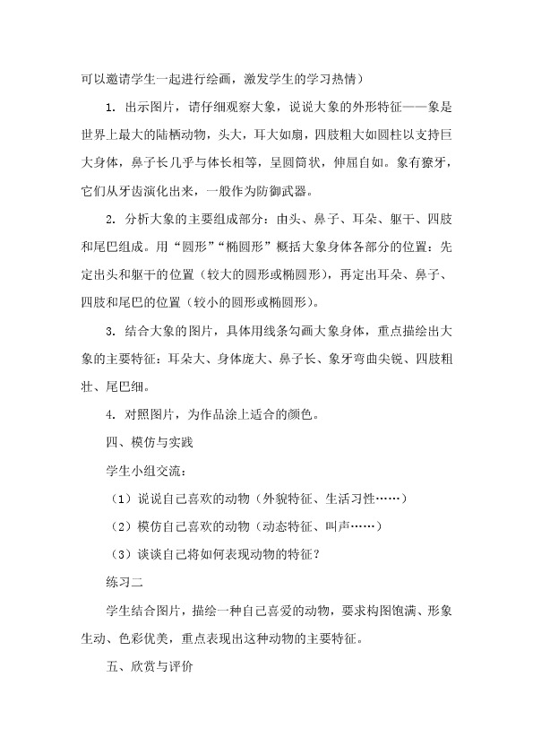 教师以大象为例,为学生示范具体的绘画步骤。(演示过程中,可以邀请学生一起进行绘画,激发学生的学习热情)
