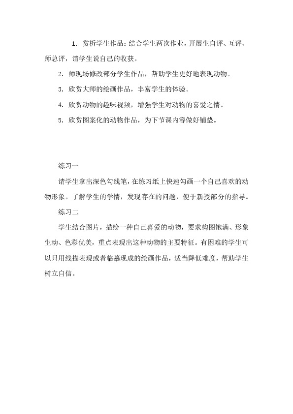 1. 引导学生进行观察、想象和表现,并运用绘画的形式创造性地表现动物的主要特征。