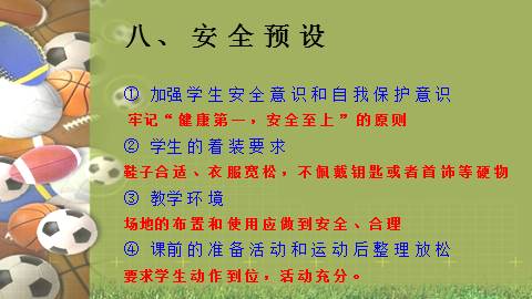 一、指导思想二、教材分析三、学情分析四、教学目标 五、教学的重点和难点 六、教法与学法七、教学准备八、安全预设九、教学过程十、预计效果