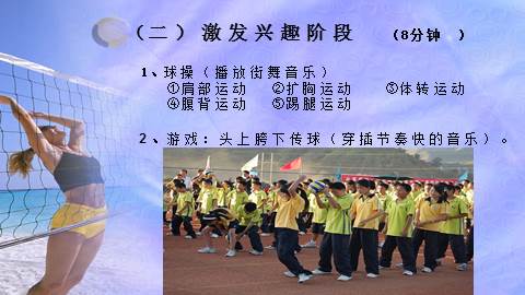 2、游戏:头上胯下传球(穿插节奏快的音乐)。