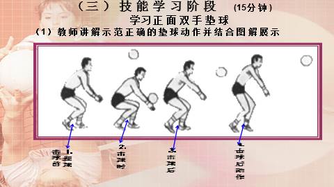 (三)技能学习阶段 (15分钟) 学习正面双手垫球