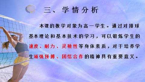 本课的教学对象为高一学生。通过对排球基本理论和基本技术的学习,可以锻炼学生的速度、耐力、灵敏性等身体素质,对于培养学生顽强拼搏、团结合作的精神具有重要意义。