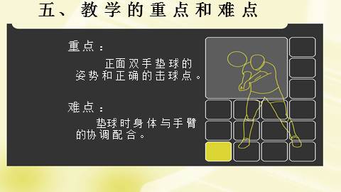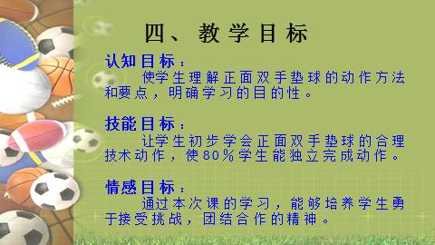 让学生初步学会正面双手垫球的合理技术动作,使80%学生能独立完成动作。