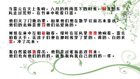 树枝在林中互相碰触着,绿叶在狂风里萧萧地响着,雷某某拍着大手,花孩子们便在那时候穿了紫的、黄的、白的衣裳,冲了出来。